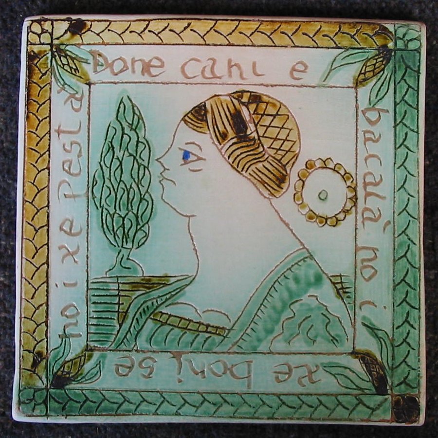 PIASTRELLA QUADRATA Lato 15 cm. Piastrella quadrata, medaglione centrale con “bella” di profilo a dx. in “hortus conclusus” con albero della vita e rosetta di buon augurio. Cornice a cordoncino continuo e germogli. Proverbio di contorno in dialetto veneto : DONE CANI E BACALA’ NO I XE BONI SE NO I XE PESTA’. Colori : verde ramina, giallo ferraccia e occhio in bleu cobalto. Al dritto ingobbiato, graffito e invetriato, il rovescio grezzo con impressa sigla “L”. |
