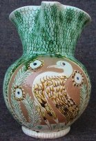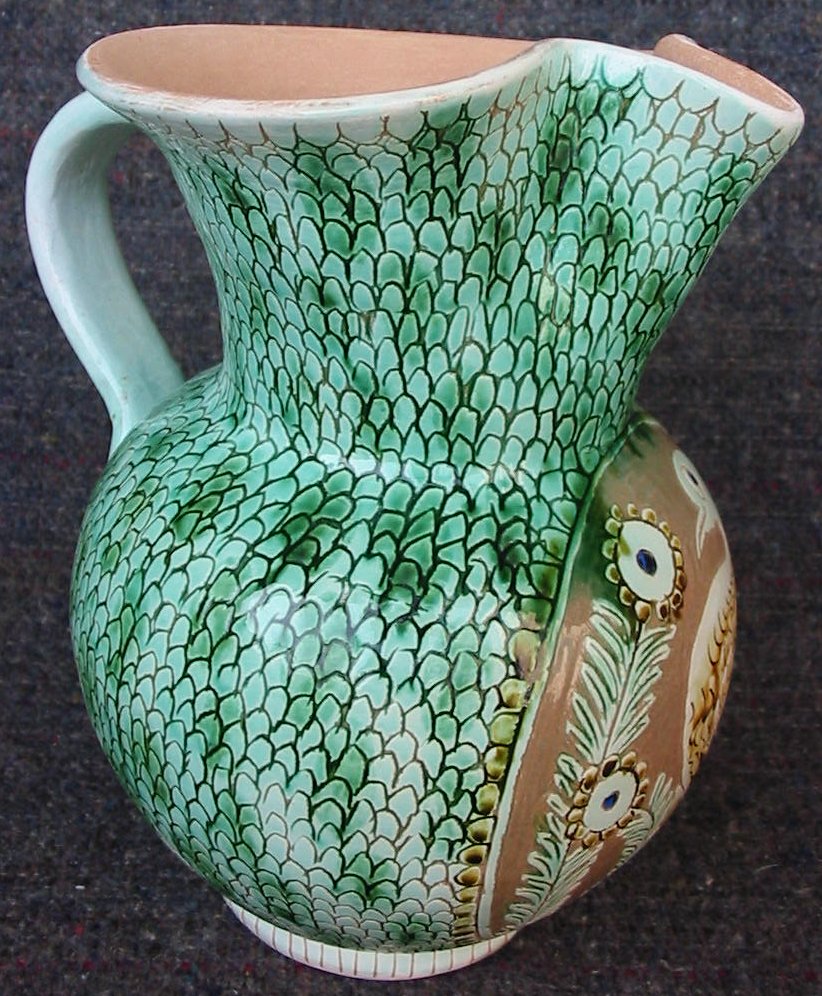BOCCALE H 20 cm. Diam. 14 cm. Capacità Lt. 1 Boccale con medaglione a fondo ribassato raffigurante un uccello ritto in piedi e tre rosette ai lati. Il resto del corpo è graffito con motivo a squame di pesce. Colori : verde ramina e giallo ferraccia. Esterno ingobbiato, graffito e invetriato, interno grezzo. |