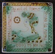 PIASTRELLA QUADRATA Lato 15 cm. Piastrella quadrata, medaglione centrale con “bella” di profilo a dx. con rosetta di buon augurio. Cornice con motivo geometrico e germogli agli spigoli. Proverbio di contorno in dialetto veneto : CHI VOL EL POMO SBASA LA RAMA CHI VOL LA TOSA CARESA LA MAMA. Colori : verde ramina, giallo ferraccia e bleu cobalto. Al dritto ingobbiato, graffito e invetriato, il rovescio grezzo con impressa sigla “L”. |
